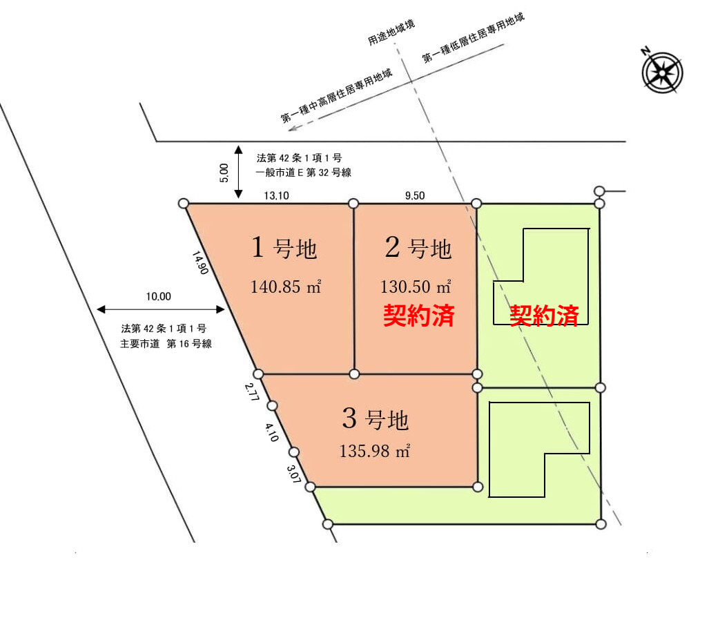 | 土地面積 | 1号地:140.85㎡ 3号地:135.98㎡(公簿) |
